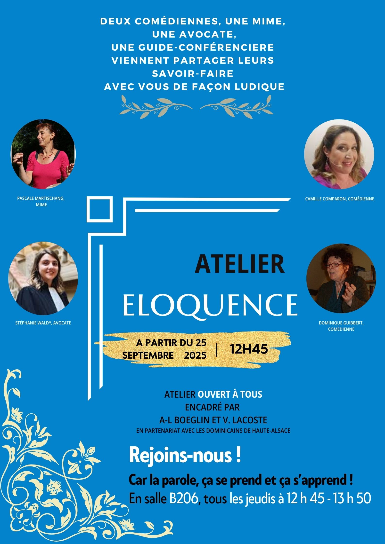 Son objectif est de faire acquérir aux élèves volontaires confiance en soi, aisance à l’oral, qualités d’expression et d’argumentation. Cet atelier est animé par des professionnels de la parole, de la voix et de la gestuelle (avocat, cantatrice, comédienne, mime, guide, etc ...).